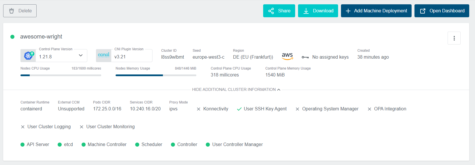 project. Those clusters will not be managed by the Kubermatic Kubernetes Platform therefore the available information