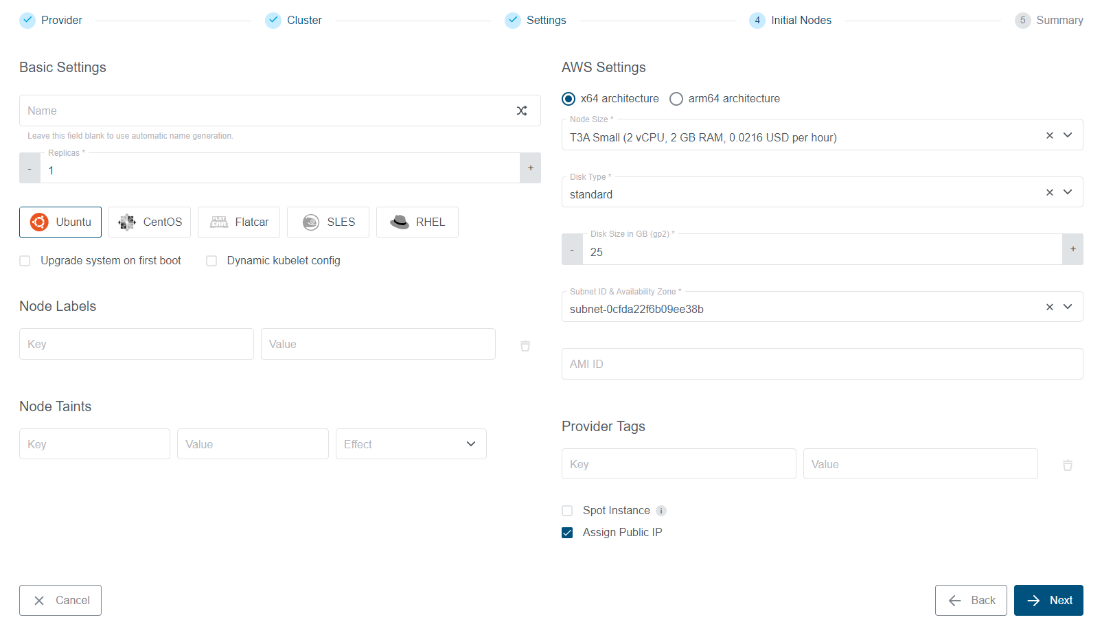 This section controls the default number of initial Machine Deployment replicas. It can be seen and changed in the cluster creation wizard on the Initial Nodes step and also on the add/edit machine deployment dialog on the cluster details.