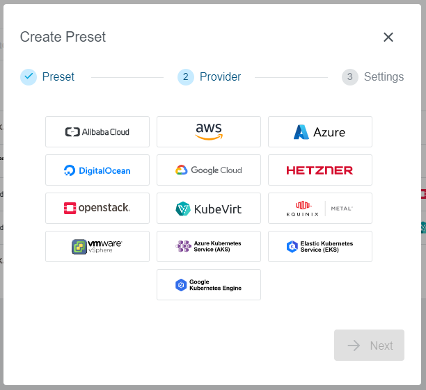 Select a provider you would like to add to the Preset. In our example, we have selected an Openstack provider. Note that every only already configured providers are available on the list.