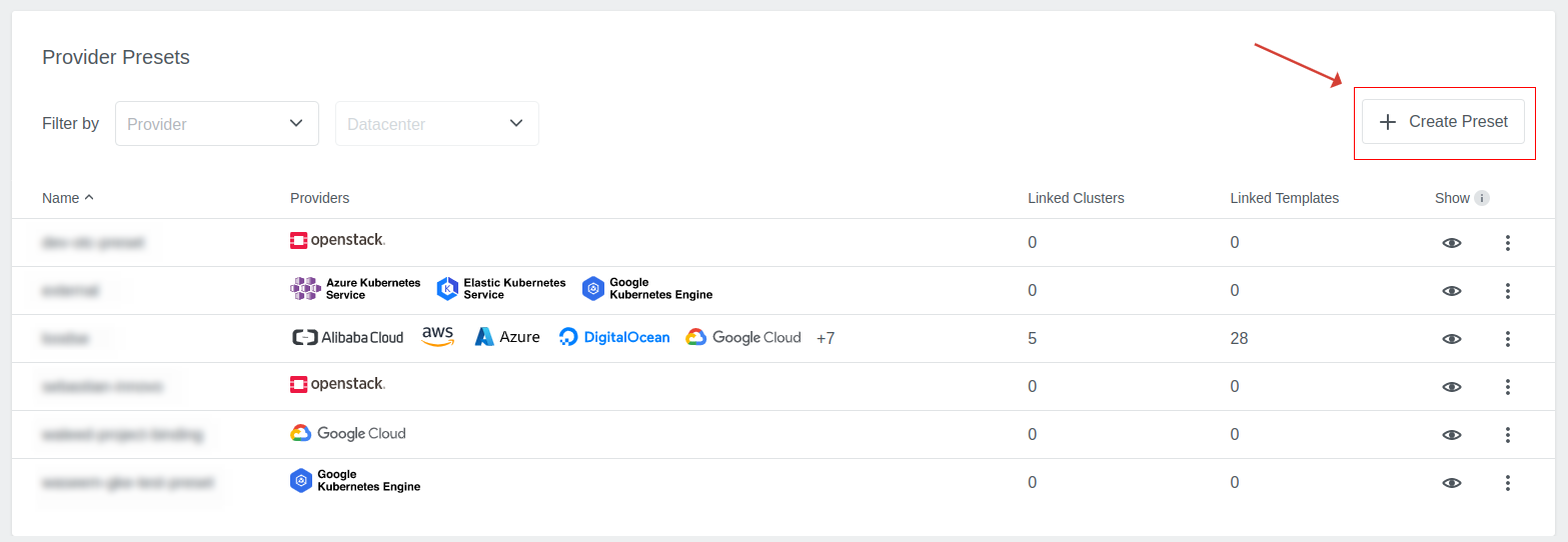 Presets give administrators the ability to predefine a set of provider information that can subsequently be used to speed up the cluster creation process. Be aware that a single Preset can contain information about multiple providers.