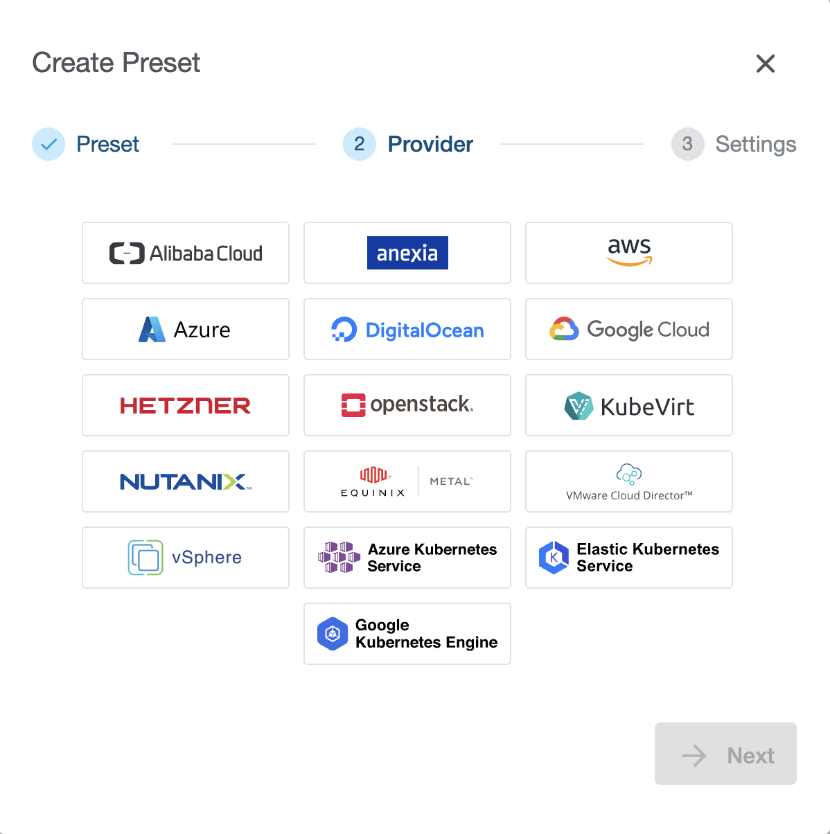 Select a provider you would like to add to the Preset. In our example, we have selected an Openstack provider. Note that every only already configured providers are available on the list.